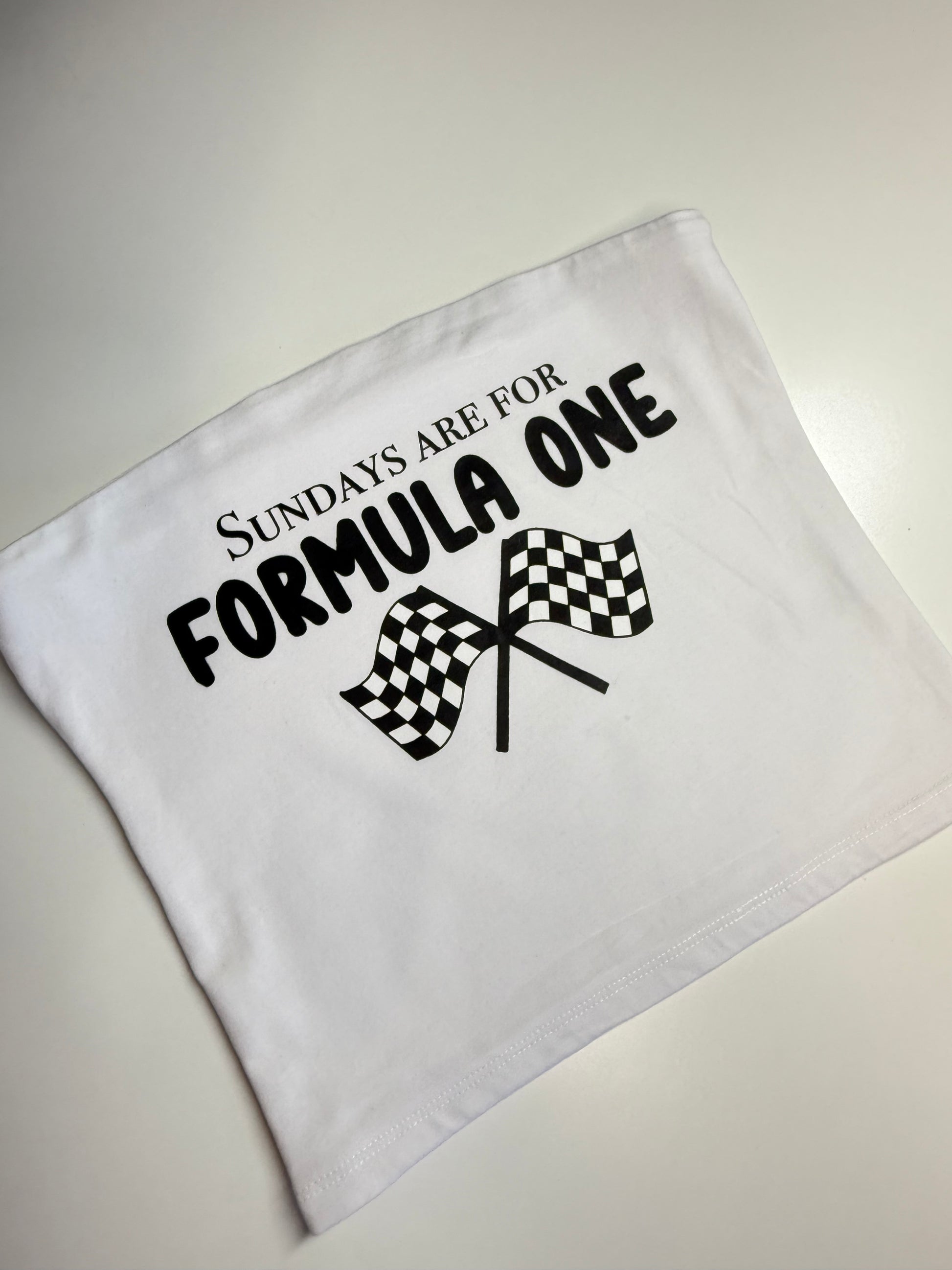 Introducing the Sundays are for Formula One printed bandeau top - a must-have for racing enthusiasts! Featuring a printed design, this sweatshirt is both stylish and comfortable. Show off your love for racing with this one-of-a-kind piece.